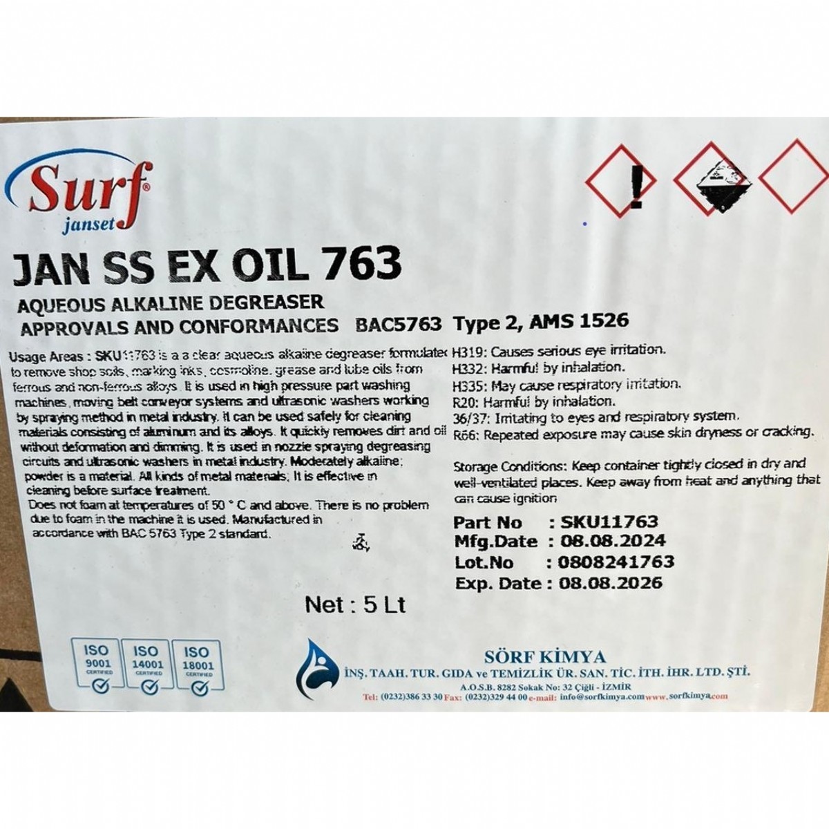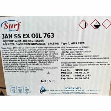 JAN SS EX OIL 763 AQUEOUS ALKALINE DEGREASER is a clear aqueous alkaline degreaser formulated to remove shop soils, marking inks, cosmoline, grease and lube oils from ferrous and non-ferrous alloys.