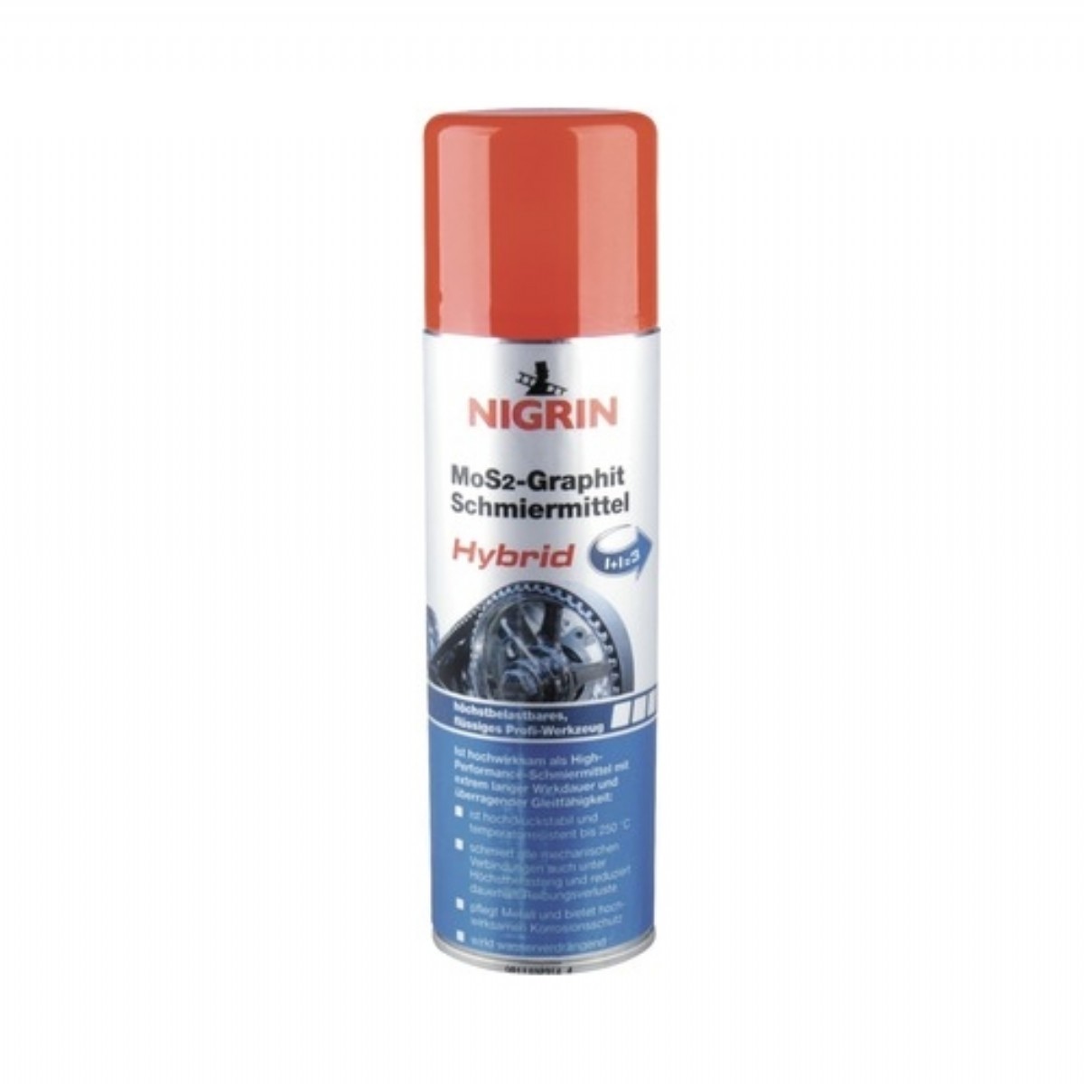 The product "MOS2-Graphit Hybrid 400ml" is a lubricant with a high degree of lubrication. It contains special additives with a high lubricating ability and is high-pressure stable and temperature-resistant till 250 °C. Due to its good adhesion, it is particularly suitable for metal components such as chains, gear wheels, crowns, springs, locks, bushings, bearings, etc. The black colouring of the product enables controlled dosage and optimal usage of the product. Due to the composition of the product, the wear of the components is slowed down and the components, such as chain links, O-rings, X-rings, are preserved longer. The product offers highly effective corrosion protection.